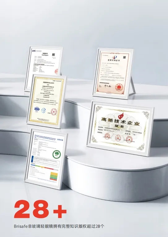 经历无数个昼夜的尝试与推翻,2019年,我们终于抓住了那道微光——将仅有0.05毫米厚的超薄高分子光学膜,通过睿光独创的特殊工艺,变成一面稳定成像的"镜面"。它轻得出奇,却能清晰映照每一处细节;你可以用力敲击它,它只会发出沉闷的响声,绝不迸射一片危险的碎片。我们叫它"Brisafe不碎镜"。